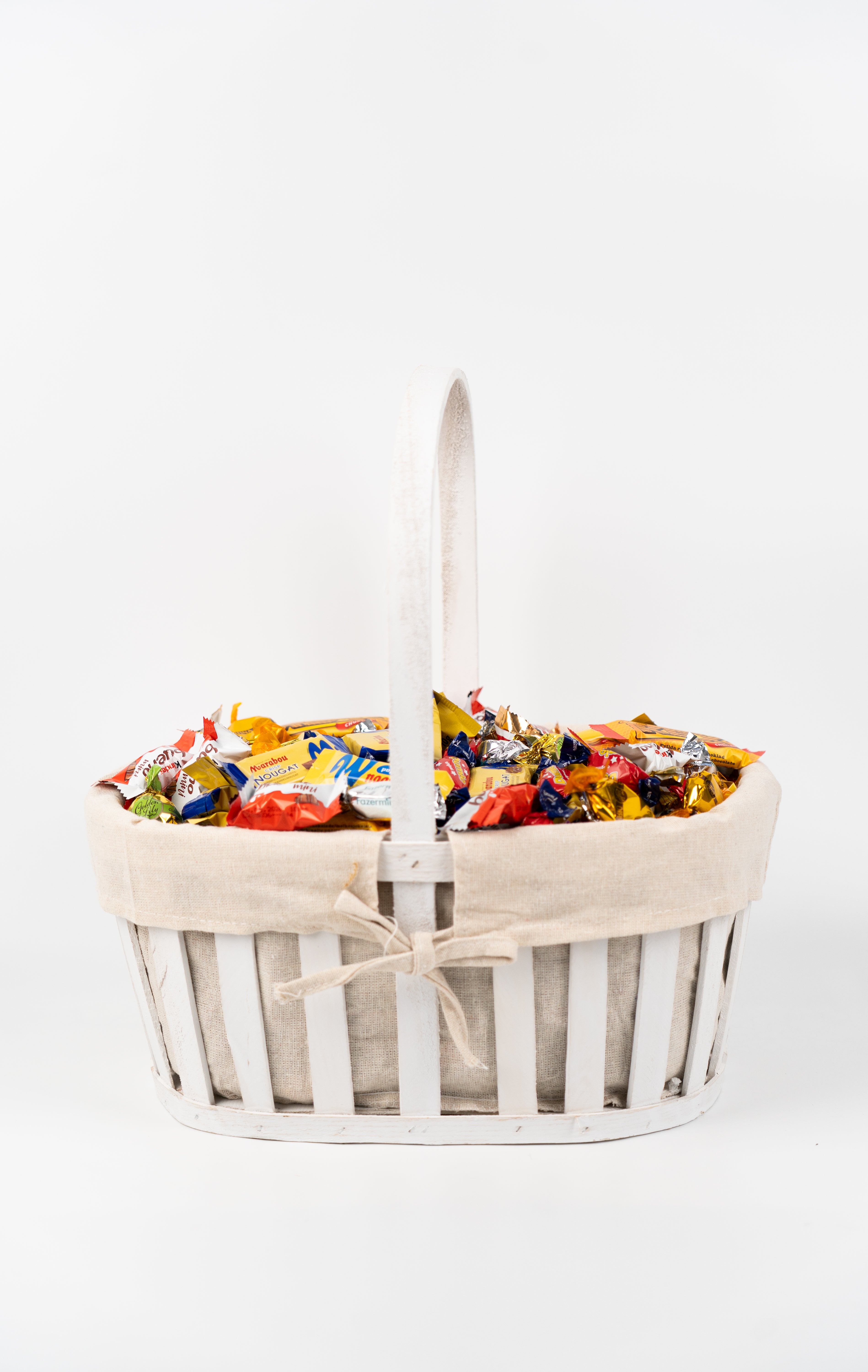 Fyllning (ca 60%)(socker, fraktionerad vegetabilisk olja och fett (palm och rapsfrön i varierande proportion), HASSELNÖT (8%), VASSLEPULVER, fettfri kakaopulver, LAKTOS, SKUMMJÖLKSPULVER, emulgeringsmedel (E322 SOJALECITIN), naturlig vaniljarom), överdrag (ca 40%): mjölkchoklad (kakao minst 28%)(socker, HELMJÖLKSPULVER (16,5%), kakaomassa, kakaosmör, VASSLEPULVER, emulgeringsmedel (E322 SOJALECITIN), naturlig vaniljarom), vit choklad (socker, kakaosmör, HELMJÖLKSPULVER, VASSLEPULVER, SKUMMJÖLKSPULVER, emulgeringsmedel (E322 SOJALECITIN), naturlig vaniljarom). Kan innehålla spår av andra NÖTTER och GLUTEN.